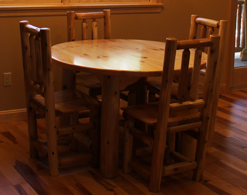 Constructed solid wood this table will be the centerpiece in your dining area. Table comes with 4 high back chairs. Available unfinished or have us finish it with Minwax stain color of your choice and multiple coats of satin lacquer. Please call us at (866) 744-9913 for more information. Custom tables are also available. Give our knowledgeable sales team a call today!
