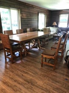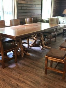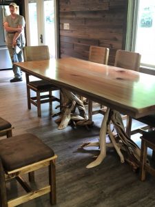 Beautiful Sycamore Tabletop with Pedestal Legs. Chairs are custom upholstered seats. Person not included.